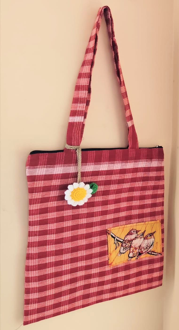 • This is a 14″x14″ tote bag made of red and white checked gamchha, with a batik cloth picture and a crochet flower charm making it look attractive.